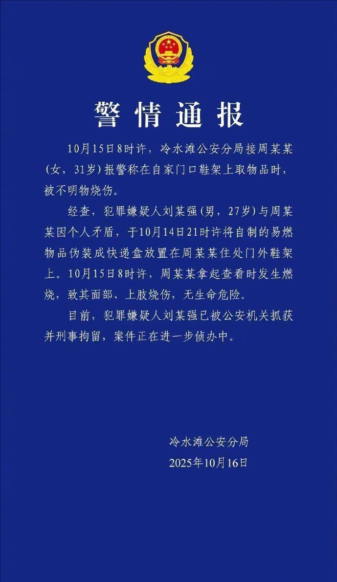 16日,19时53分,湖南省永州市公安局冷水滩分局发布警情通报:10月15日8时许,冷水滩公安分局接周某某(女,31岁)报警称在自家门口鞋架上取物品时,被不明物烧伤。经查,犯罪嫌疑人刘某强(男,27岁)与周某某因个人矛盾,于10月14日21时许将自制的易燃物品伪装成快递盒放置在周某某住处门外鞋架。10月15日8时许,周某某拿起查看时发生燃烧,致其面部、上肢烧伤,无生命危险。目前,犯罪嫌疑人刘某强已被公安机关抓获并刑事拘留,案件正在进一步侦办中。